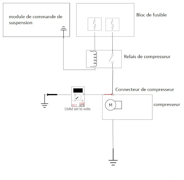 En revanche, si vous trouvez un problème avec le circuit de commande du compresseur, vous devrez tracer le schéma de câblage et effectuer des tests supplémentaires. Un problème avec le côté alimentation du circuit peut indiquer un relais défectueux, un fusible grillé, des problèmes de câblage / connecteur ou un problème avec le module de commande de suspension.